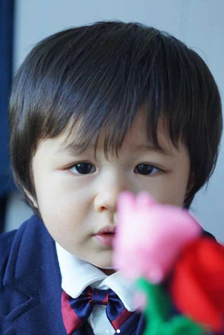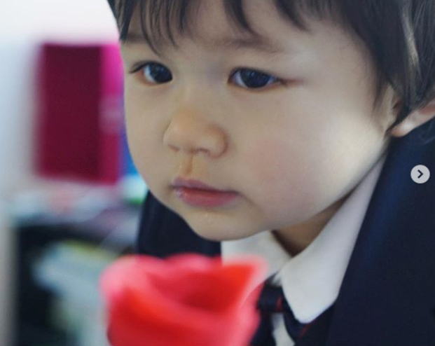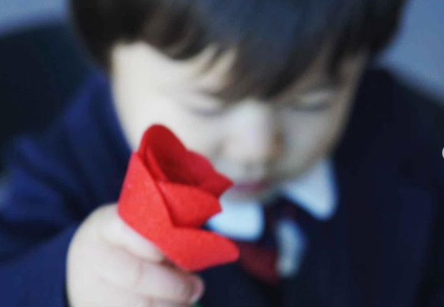 从晒出的照片看,钟嘉欣的小儿子拿着一朵玫瑰花,给镜头后的母亲,不知道是不是爸爸教儿子这样做的呢?