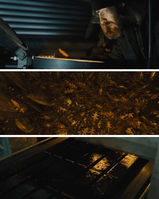 在蛋白块制作车厢,他们见到了食物生产的全过程,更发现大家每天吃的东西竟然都是用蟑螂尸体做成的: