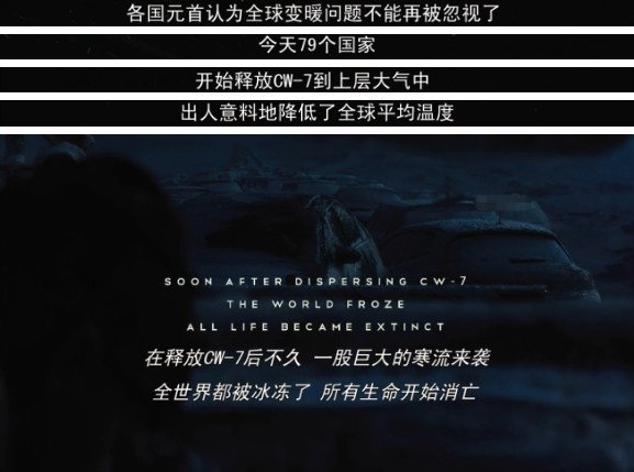 为了解决已经糟糕到不可忽视的全球变暖问题,各国首脑在商议后决定,利用人造冷却剂CW-7人为干预气候进一步恶化。
