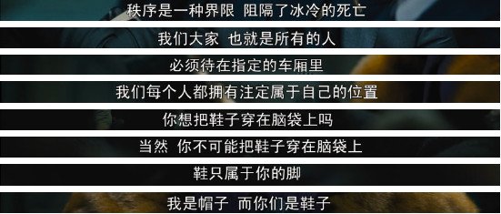 除此之外,上乘的镜头语言、音效视效以及场地布景也让观众沉浸于剧情,相信所看到的一切,跟着主人公的心思一起上下起伏,初始哀于末位车厢生存艰辛,中途叹于车厢上层生活,最后又惊于一切的真相……而非凌驾于剧情之上,指摘影片的种种漏洞。