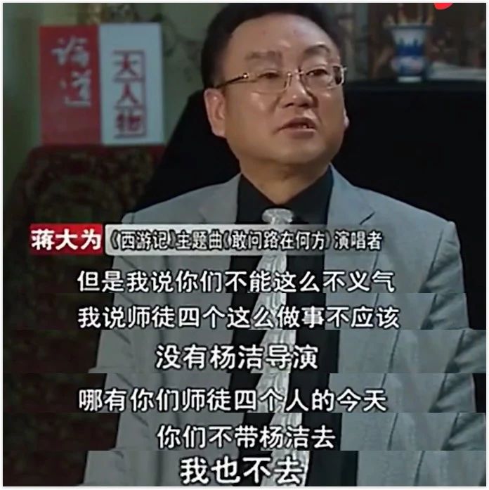 蒋大为认为师徒四人这么做实在太不讲义气,先不说他们之间发生了什么矛盾,但杨洁对《西游记》付出的功劳是不可磨灭的,就像蒋大为说的,没有杨洁,他们师徒四人哪里会有今天呢?