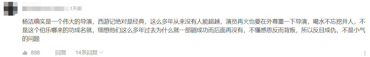 对于这件事情,网友们也是一边倒地站在杨洁导演这边,虽然说杨洁导演肯定也有做得不妥当的地方,但师徒四人也不应该联合起来孤立杨洁,忘记“伯乐之恩”,做出忘恩负义的行为。