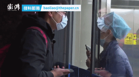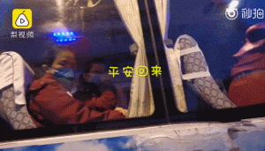 一位男士站在大巴车外带着哭腔对车内的医务人员妻子喊话: