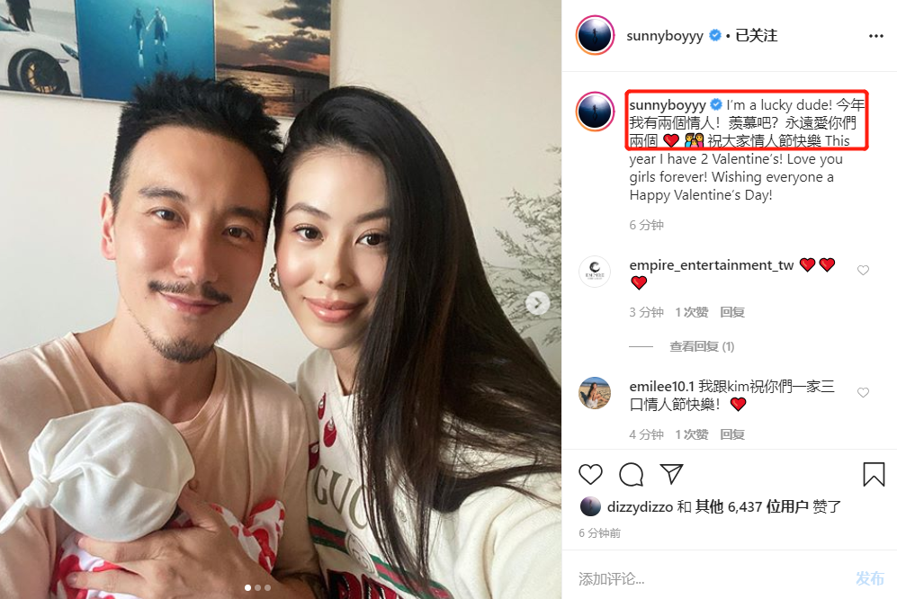 在去年12月,蔡诗芸为王阳明生下一枚可爱的宝宝,王阳明更是感慨万千,内心非常喜悦和自豪,如今迎来生娃后的首个情人节,王阳明开心的晒出全家福庆祝。
