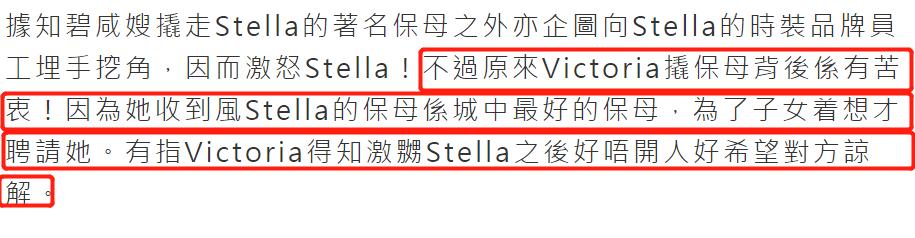 据港媒表示,贝嫂撬走Stella的保姆之外,还企图挖走Stella的时装品牌员工,因而激怒了Stella,不过事实上维多利亚单纯只是因为听闻Stella的保姆是当地最好的保姆,为了照顾小七,她才高薪聘请对方到家中工作。有指贝嫂知道Stella生气后,还托双方共同友人传话,希望对方谅解。