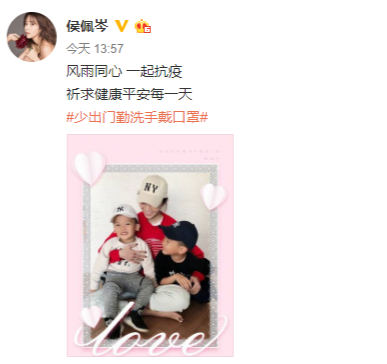 2月14日,侯佩岑晒出与两个儿子的合影,并配文:“风雨同心,一起抗疫,祈求健康平安每一天”。