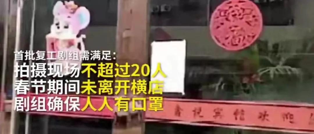 2月13日,横店影视城开始逐步复工,此前,横店影视城有发布复工指导意见,称将会分阶段复工,且复工要求很严格,必须要符合三点,春节期间未离开过横店,拍摄现场不能超过20人,剧组确保人人有口