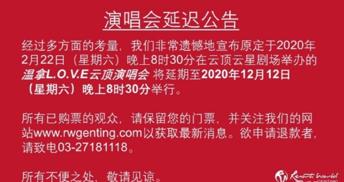 据悉,温拿L.O.V.E云顶演唱会原定于2020年2月22日20:30于云顶云星剧场举办,延迟公告中表示经过多方面考量,演唱会决定延期至2020年12月12日20:30举行。