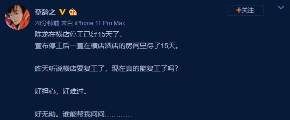 2月12日,章龄之发文,称丈夫陈龙在横店停工已经15天了,宣布停工后一直在横店酒店的房间里待了15天。但近日听闻横店要复工了,“现在真的能复工了吗?好担心,好难过。好无助。谁能帮我问问……”字里行间透露着对老公陈龙的担忧。