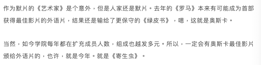 所以,就算《寄生虫》拿不到,接下来,还会有别的外语片能拿到最佳影片。
