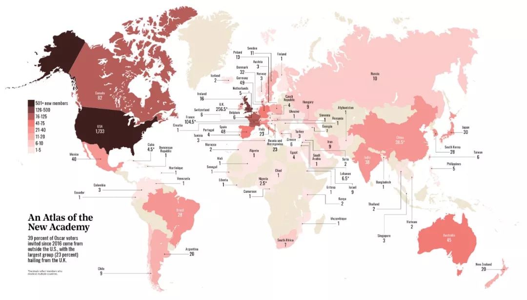 另外这个数据图表,来自《好莱坞报道者》,奥斯卡自2016年以来,新增成员,39%来自美国以外的其他国家。
