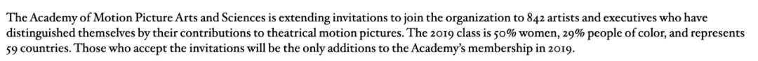 它代表着学院成员的组成,也就是那些投票人,同样越来越趋向于多元化,女性、有色人种、非美国人都在增加。