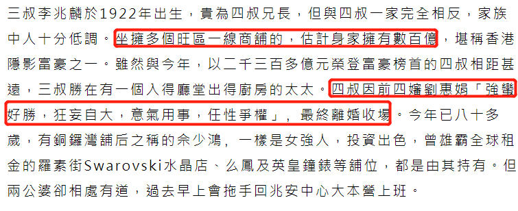 据悉四叔李兆基的前妻刘惠娟狂妄自大、任性夺权,所以四叔的婚姻生活并不美满。不过相比起来,三叔李兆麟倒是娶了一个贤内助,女方在生意上给李兆麟帮助不少,还奠定了隐形富豪的基础。