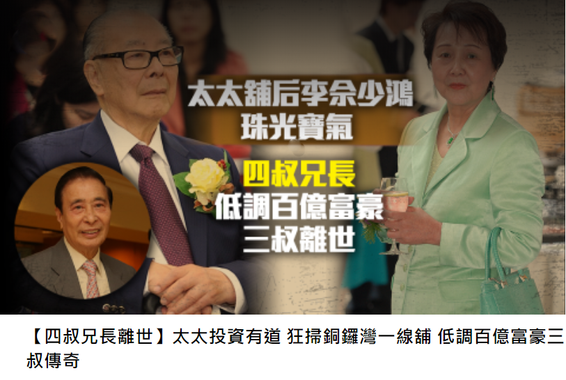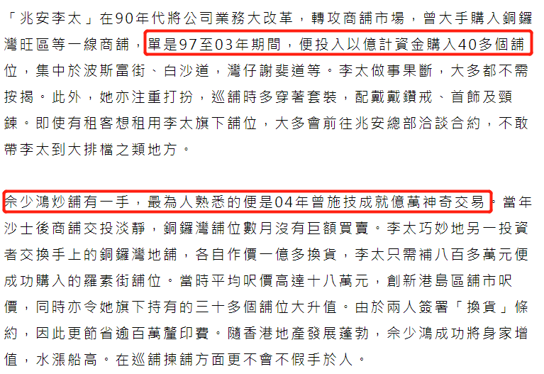 佘少鸿在投资炒铺方面有一手,在90年转攻商铺市场以来,已经创造了不少亿万的神奇交易,本人更是珠光宝气,非常注重打扮。