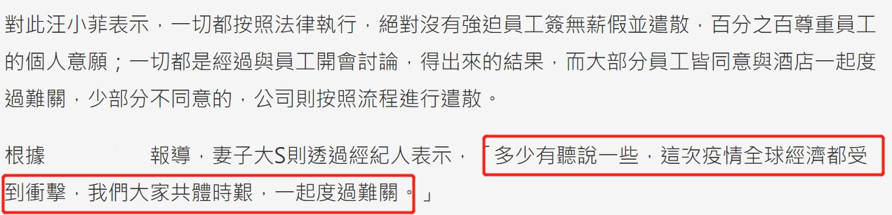 同时大S也透过经纪人,向媒体记者发声支持老公汪小菲,她说:“多少有听说一些,这次疫情全球经济都受到冲击,我们大家共克时艰,一起渡过难关。”