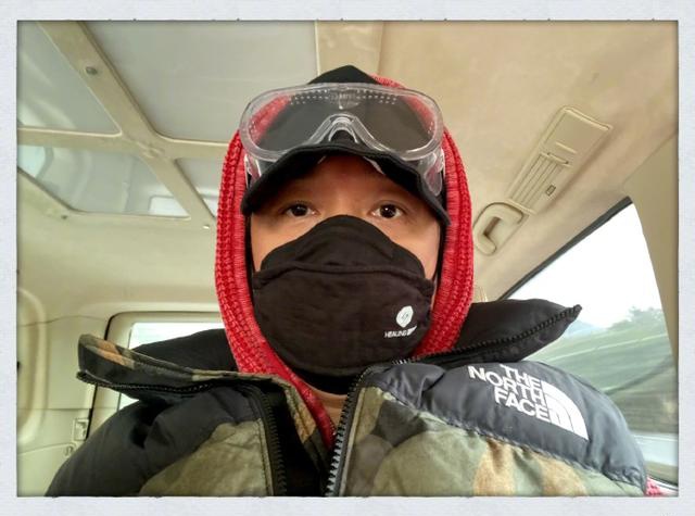 潘粤明还晒出一张外出买菜的照片,照片中潘粤明身穿军绿色与黑色拼接冬装上衣,为做好防护工作潘粤明不仅戴了鸭舌帽还将内搭的红色帽子也戴起来,脸部用口罩与护目镜进行保护,装备十分齐全。