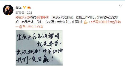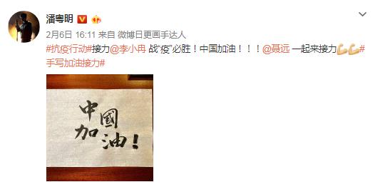 潘粤明十分关注与疫情有关的消息,近日网上发起#抗疫行动##手写加油接力#活动,2月6日演员李小冉参与"抗疫行动"活动时@潘粤明接力,同日下午潘粤明手写"中国加油"毛笔字并@聂远接力活动,为中国加油。