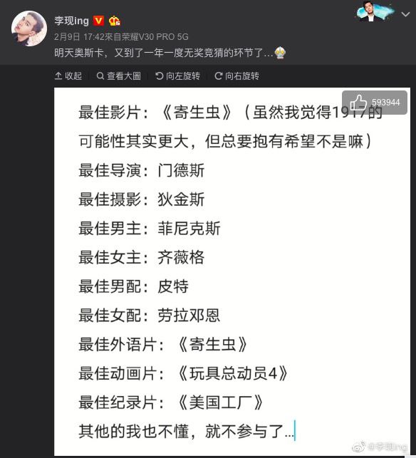 在颁奖正式开始之前,国内豆瓣、微博等社交平台,各类电影媒体、资深影迷等已经率先开启奖项预测,对于重磅奖项的预判八九不离十。 如2019年崛起的流量演员李现,其预测的奥斯卡10个奖项,正确率达到了9个,还成了热搜沸点话题。
