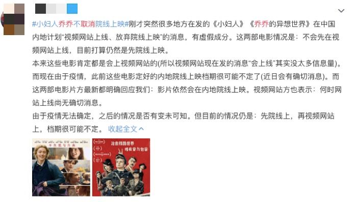今年在疫情与《囧妈》《肥龙过江》等网上公映电影的先例的影响下,爱奇艺消息公布后,不少公众发出疑问: “这是要直接线上上映吗? ”片方迅速作出了否定,《小妇人》《乔乔》《1917》三部电影陆续发布消息,宣布“不会先在视频网站上线,目前打算仍然是先院线上映”,网站方也不知道具体上线时间。 爱奇艺电影官方微博也删除了电影即将上线的物料海报。