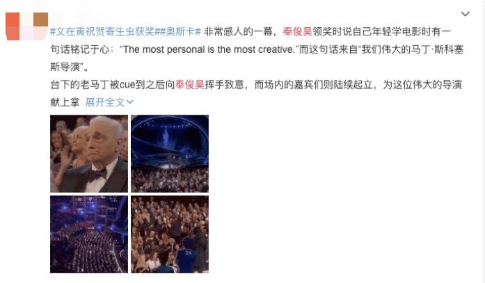 今年奉俊昊导演的《寄生虫》在戛纳电影节一举拿下金棕榈大奖后,奥斯卡上又一连拿下最佳影片、最佳导演、最佳国际电影、最佳原创剧本四个重磅奖项,成为获得奥斯卡92年历史上首部非英语电影的最佳影片,新纪元到来。 奉俊昊本人拿着小金人傻笑的动图、玩笑要喝酒喝到明天早晨的段子、致辞时对马丁·斯科塞斯导演的深情表白等都在微博上疯传。