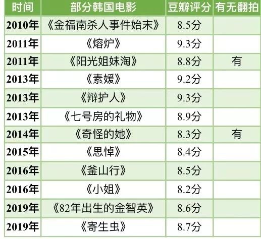 在国内,虽然韩国电影鲜少在票房市场露面,但影迷已经察觉到韩国电影的受众群体与话题影响力在逐渐增大。 豆瓣电影显示,从2010年至今,豆瓣评分8.0以上的电影达到53部,其中在国内引起话题讨论或者进行翻拍的电影不在少数。