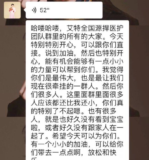 谢娜还发布了一个很长的语音说:今天特别开心,能有机会能够有一点小小的力量帮到你们,我觉得你们是最伟大的,也是最让我们牵挂的一群人,你们很多人比我还小,你们特别了不起。