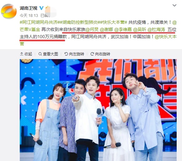 2月11日,湖南卫视宣布收到快乐家族何炅、谢娜、李维嘉、吴昕以及杜海涛5个主持人100万元的捐款,支援疫情防控战