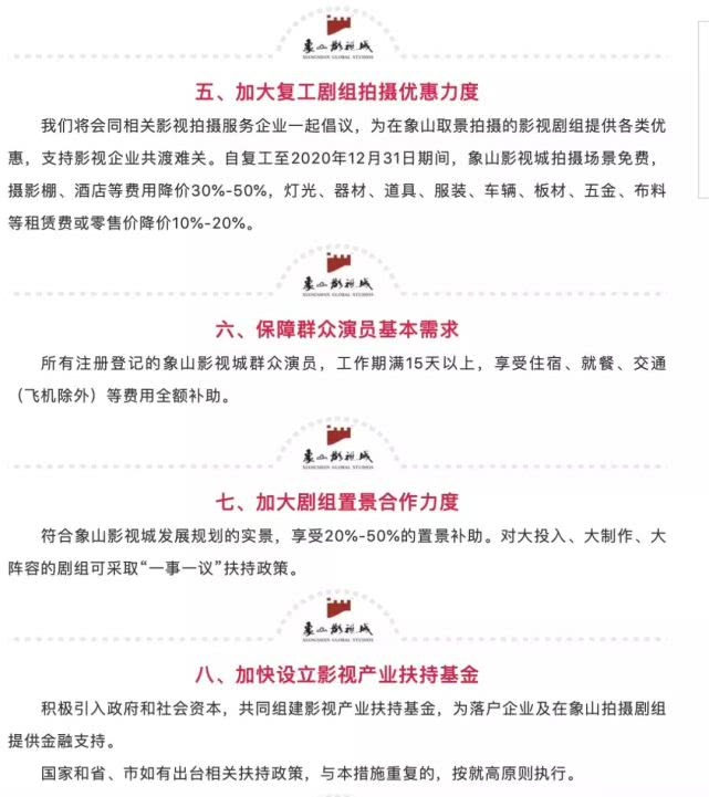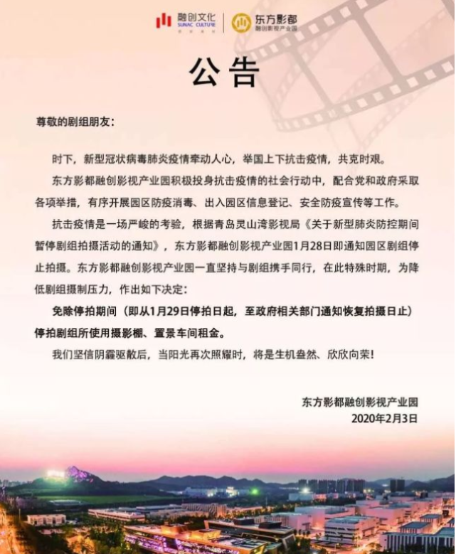 作者/马克李 本以为2020年将是影视行业重整旗鼓的开端,但新冠病毒肆虐却又将其打回原形甚至更加不堪。 整个行业“受灾”最严重的,可能是影视拍摄基地——一方面,所有剧组拍摄全部停工;另一方面,游客全部无法接待,旅游损失动辄数千万。 今天最新的消息是,国内头部的影视拍摄基地——象山影视城,宣布了一系列新政策,包括:疫情期间在影视城拍摄的剧组,场地费全免,住宿费减半;未来复工后,剧组同样拍摄场景免费,摄影棚、酒店等费用下降30%到50%。 而此前,横店影视城、东方影都也先后宣布了疫情期间场地费、住宿费减免的相关政策。 一场影视行业的“自救运动”已然开始。 “受疫情影响,象山影视城损失已超2000万” 2020年1月31日,在新冠疫情影响下,全国影视城和剧组,悉数“按下暂停键”。 当日,中国广播电视社会组织联合会电视制片委员会和演员委员会联合发布《关于新冠疫情期间停止影视剧拍摄工作的通知》(以下简称“通知”)称,疫情防控期间,所有影视制片公司、影视剧组及影视演员,应按照国家有关规定,暂停影视剧拍摄工作。影视剧拍摄工作应待国家防疫部门宣布疫情防控解除后恢复。 简而言之,影视剧组全面无限期停工。 事实上,在《通知》下发前就已有多部正在拍摄中的剧组主动宣布暂停拍摄,剧组原地待命。 《清落》制片人陈益韬发微博称,因为停工,依然要保障剧组人员近两百人的餐饮、住宿等日常支出,“一天亏50万,不知道多久能重新拍摄”。 早在1月27日,象山影视城中所有剧组的拍摄活动就已暂停。此外,影视城已于1月25日宣告闭园,暂停向游客开放;原定于正月初一至十五的“春节影视大庙会”活动也取消。 值得一提的是,象山影视城全面歇业也对企业经营状况带来了难以接受的冲击,宁波影视文化产业区管委会主任陈建瑜在接受河豚文旅的采访中表示:“受疫情影响,目前亏损已经超过2000万,在去年春节期间象山影视城则盈利1500万。” 而为了能够让更多企业活下去、为了能够让行业共渡难关,象山影视城在今日发布8项让利举措为行业注入一剂肾上腺素。 对此,象山方面表示:“我们象山影视城愿意承担一份应尽的社会责任,与全国影视企业、影视剧组和影视人一起共克时艰、共渡难关,全力保障影视行业顺利运营,大力支持影视产业健康发展。为此,特推出八项措施。” 线上代办、线上预约、高达50%置景补助、象山影视城拍摄场景免费、象山影视城拍摄场景免费、灯光、器材、道具、服装、车辆、板材、五金、布料等租赁费或零售价降价10%-20%…… 通过上述8项举措来看,象山影视城既在流程审批为剧组提供便利,同时也是在用“真金白银”让利剧组。 据陈建瑜介绍,在复工之后将会有8-9个剧组进驻象山,而在停工期间,象山方面通过网络与各个剧组沟通布局需求、落实群众演员以确保剧组在进驻后就可以立即开机。 此外,受停拍影响,目前仍有约500影视从业者滞留在象山,象山方面则统一将其安排在新桥镇的宾馆,同时成立了“剧组服务管控小组”,配备专业医疗团队,为剧组人员每日定时量体温监测,并保障剧组生活物资的储备。 除象山影视城之外,其他影视拍摄基地也在行动。 2月3日,青岛东方影都方面也发布了针对疫情的减免政策,公告内容显示,东方影都融创影视产业园将免除停拍期间各摄制组所使用影视棚、置景车间租金。 1月31日下午,横店影视城发布公告称:在剧组停拍期间,横店影视城下属所有拍摄基地、摄影棚费用全免;剧组人员在横店影视城旗下各酒店的房费减半。此外,停拍期间,向在横店的演员公会群众演员每人提供一个月的300元租房补贴和200元的生活补贴。 停机、待岗、无通告,脆弱的影视行业如何“自救”? 面对此次疫情,影视基地方面的带头让利显然不够,企业如何减少损失,行业如何共克时艰,成为近期最大的议题。 前天,曾参与《流浪地球》、《我不是药神》等头部影片的影联传媒发布内部通知:由于疫情持续发展,整个电影市场严重低迷,电影行业遭受前所未有地重创。影联传媒决定今日起至3月31日人员请于所在地原地待岗。 待岗期间,公司将会按照不低于北京市最低工资标准的70%支付基本生活费用。 剧组方面,在《通知》下发后,已有十余部影视剧纷纷宣布停工,其中包括备受期待的《大江大河2》、杨幂、白宇主演的医疗情感关怀剧《谢谢你医生》包括于正新剧《传家》、赵丽颖、王一博主演的古装武侠剧《有翡》等。 此外,近期多家明星工作室放出艺人2020年2月份行程计划,结果竟惊人的一致——暂无公开行程或者行程暂未确定。 其中不乏李易峰、赵丽颖、杨幂、李沁、周冬雨、迪丽热巴这类常年通告“7*24小时”的大咖。 综艺方面同样未能幸免,原定于1月30日开播的《王牌对王牌》决定延后播出;节目从筹备到录制已经接近1整年的时间的《青春有你2》目前也已宣布延期录制。 据悉,目前《青春有你2》节目组数百位工作人员停工,百余位选秀选手无事可做,录制地点每天租金费用照付,节目前期的宣发白费。 除此之外,《漫游记》、《了不起的长城》、《我家那闺女2》、《快乐大本营》、《新声请指教》、《天赐的声音》等等综艺节目全部无限期延播。 然而,新冠疫情对于影视行业所造成的冲击绝不仅此而已。 众所周知,往年春节用“一票难求”来形容院线表现毫
