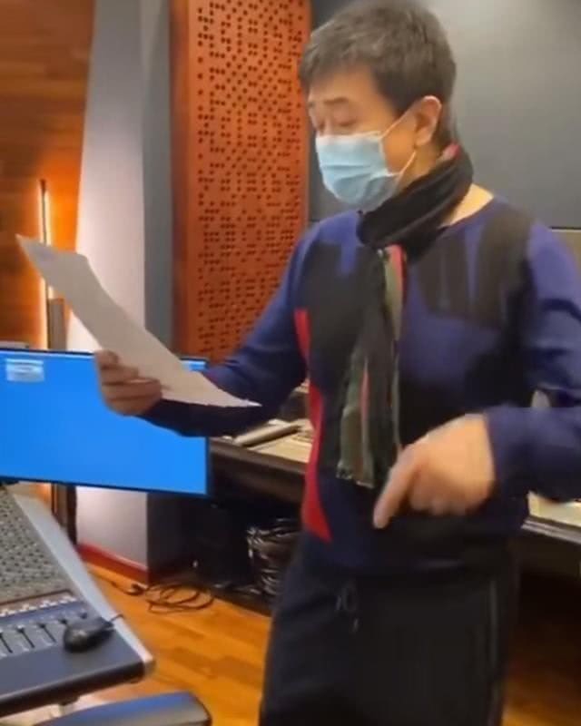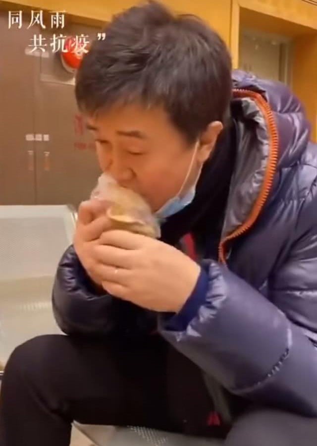 视频中,付笛生戴上口罩,身穿蓝色毛衣,戴着围巾,头发灰白略显疲惫,站在录音棚内一遍一遍的认真排练,休息时就简单吃了点东西。